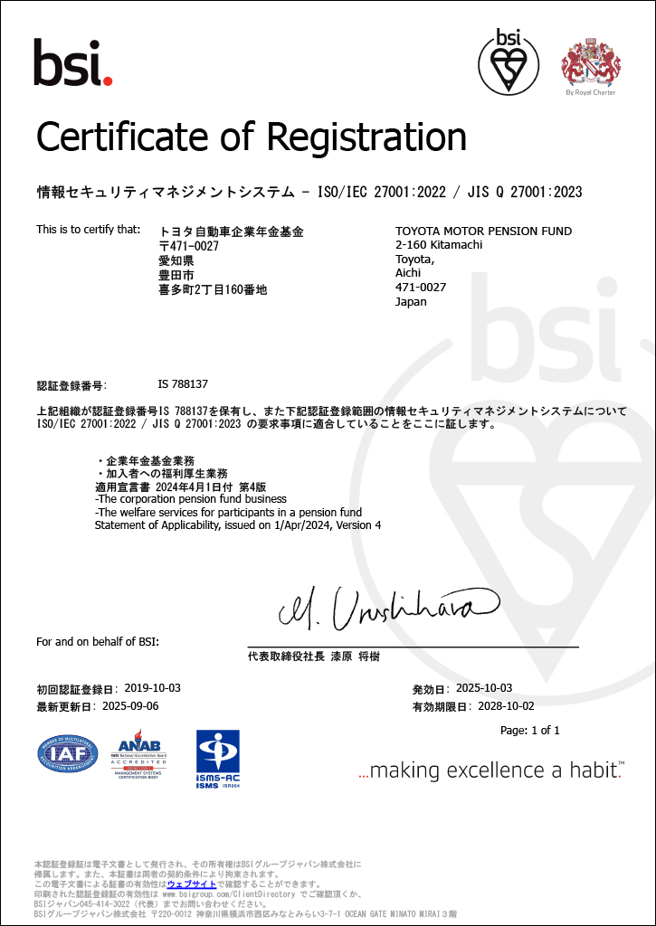 当基金では、お客様から信頼される企業年金を目指すため、「ISO27001」「ISO9001」を認証取得しております。皆様に信頼される基金であり続けるために、今後も積極的に活動してまいります。